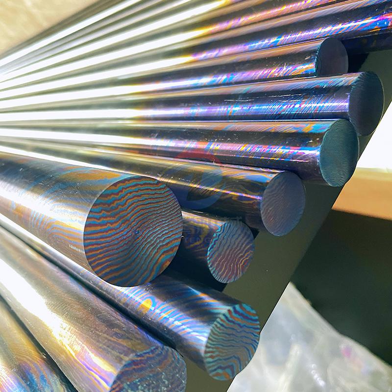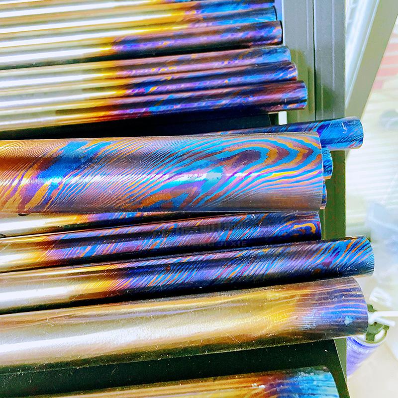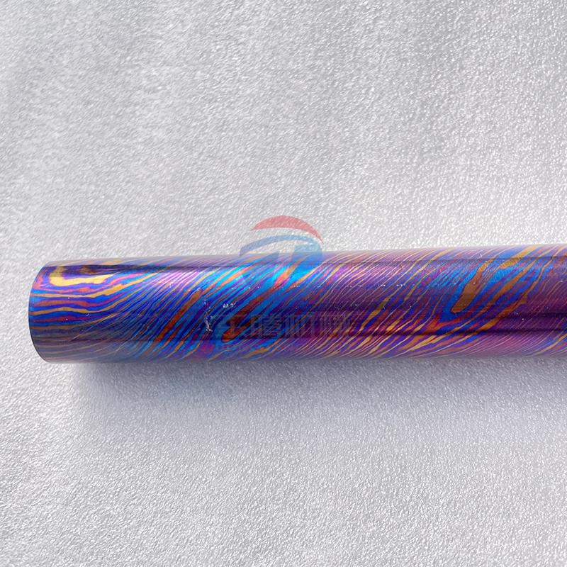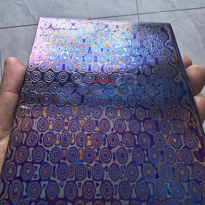 钛马士革的制作工艺极为复杂,借鉴传统大马士革钢的叠锻理念,先将不同牌号、不同成分的钛合金板材切割、堆叠后进行真空焊接,再经高温高压反复锻打、扭转、拉伸,使多层钛合金完美熔合,形成自然流动、独一无二的肌理纹路,如波浪纹、云雾纹、流水纹等。后续通过阳极氧化或热处理工艺,无需添加任何颜料,即可在表面生成稳定氧化膜,呈现出蓝、紫、金、绿等幻彩光泽,光影流转间质感十足。